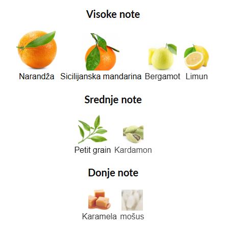 - Visoke note: Narandža, Sicilijanska mandarina, Bergamot, Limun