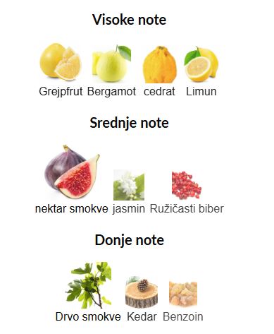 - Donje (bazne) note: Drvo smokve, Kedar, Benzoin
