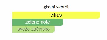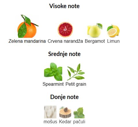 - Visoke note: Zelena mandarina, Crvena narandža, Bergamot, Limun