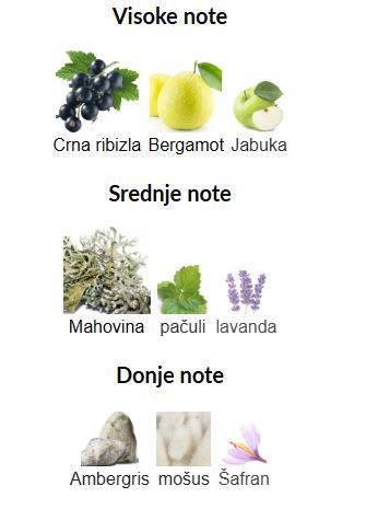 - Gornje note: Bergamot, Jabuka i Crna jagoda
