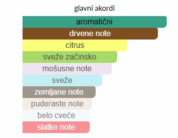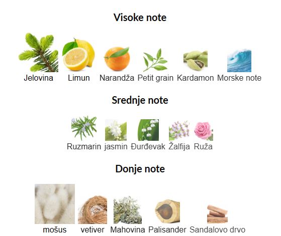 - Visoke note: Jelovina, Limun, Narandža, Petit grain, Kardamon, Morske note