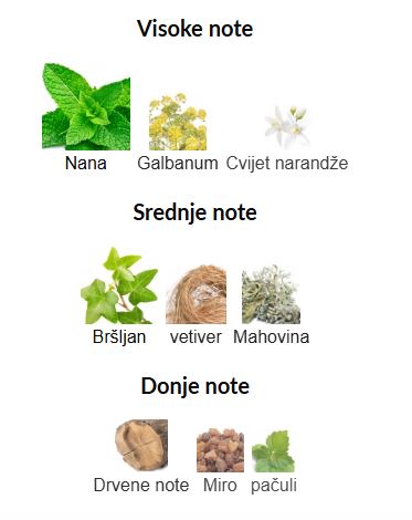 - Gornje note: Nana, Galbanum, Cvijet narandže