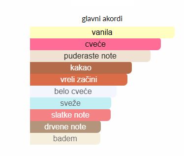• Gornje note: Ljiljak, peonija, heliotrope, jasmin, roža, garija