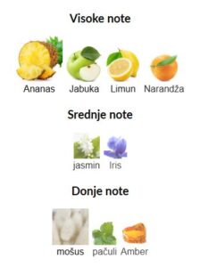 - Srednje note: Mimoza (Acacia), Kruška, Paradisone