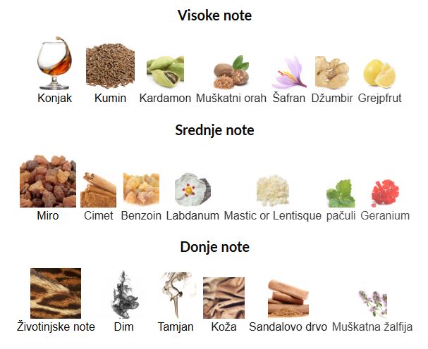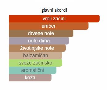 - Bazne note: Sandalovina, dimna koža, klareja salvia, animalic accord, incenso