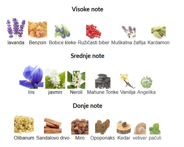 - Gornje note: Benzion, ružičasti paprika, klareja salvia, lavanda, kardamon