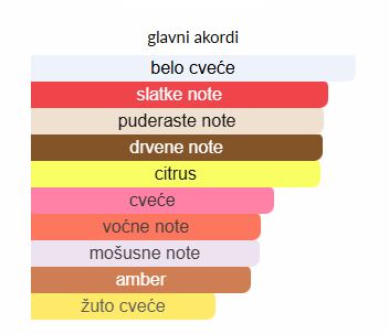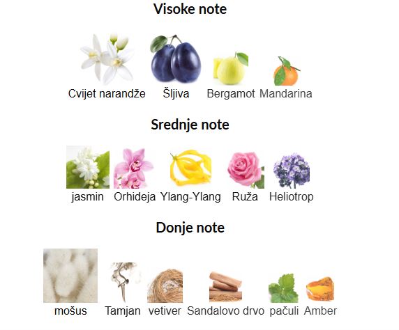 - Gornje note: Cvijet narandže, Šljiva, Bergamot, Mandarina
