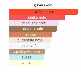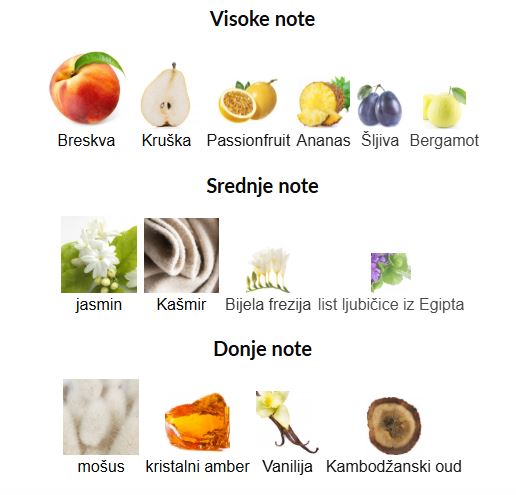 - Gornje note: Bergamot, ananas, breskva, marakuja, kruška i šljiva.