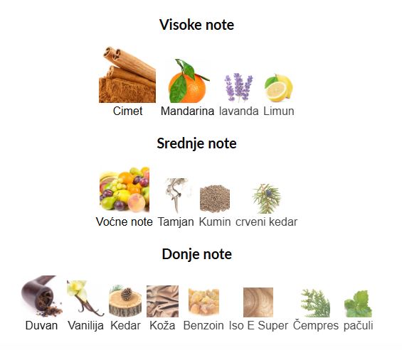 - Bazne note: Duvan, vanila, kedar, koža, benzoina