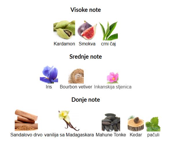 - Bazne note: Sandalovo drvo, Vanilija sa Madagaskara, Mahune Tonke, Kedar, Pačuli