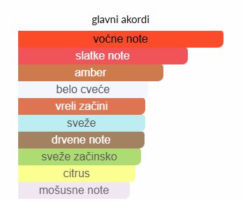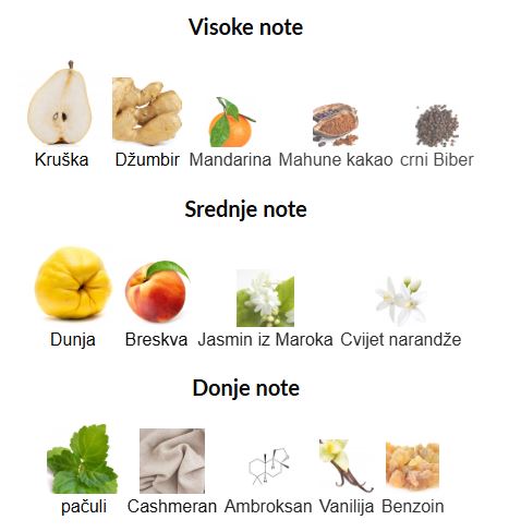 - Gornje note: Kruška, Džumbir, Mandarina, Kakao mahune, Crni biber