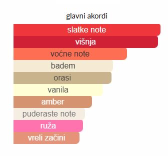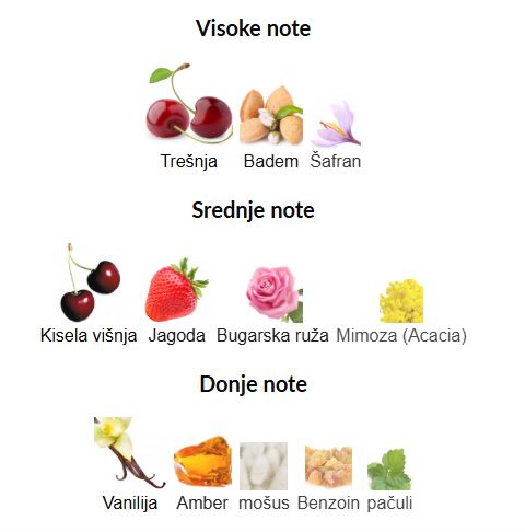 - Srednje note: Kisela višnja, Jagoda, Bugarska ruža, Mimoza (Acacia)