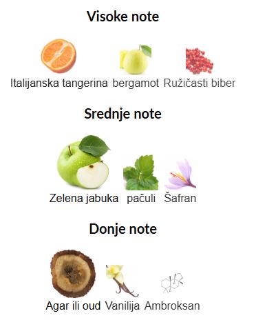 - Srednje note: Zelena jabuka, Pačuli, Šafran