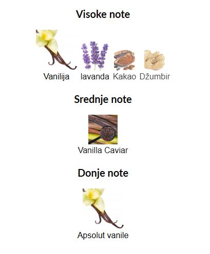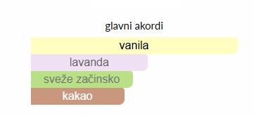- Gornje note: Vanilija, Lavanda, Kakao, Džumbir