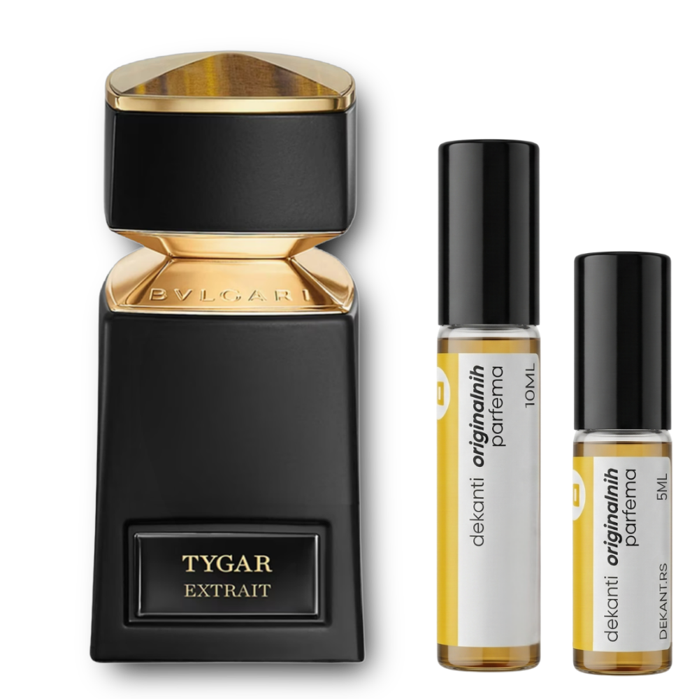 Bvlgari Tygar Extrait je intenzivna, sofisticirana citrus-ambrasta uniseks parfemska voda koja spaja jarke citrusne vrhunske note grejpfruta sa toplim, senzualnim akordima ambergrisa i peru balsama. Miris otvara sa svežim, energičnim grejpfrutom, razvija se u bogat, topao karakter i ostavlja upečatljiv, dugotrajan trag koji odiše snagom, elegancijom i samopouzdanjem.