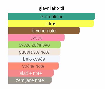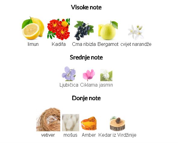 - Gornje note: Limun, kadifa, crna ribizla, bergamot i cvet narandže. Ove note unose osvežavajući i voćno-cvetni uvod.