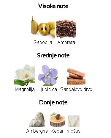 - Gornje note: Sapodila i ambreta. Ove note unose osvežavajući i voćni uvod.