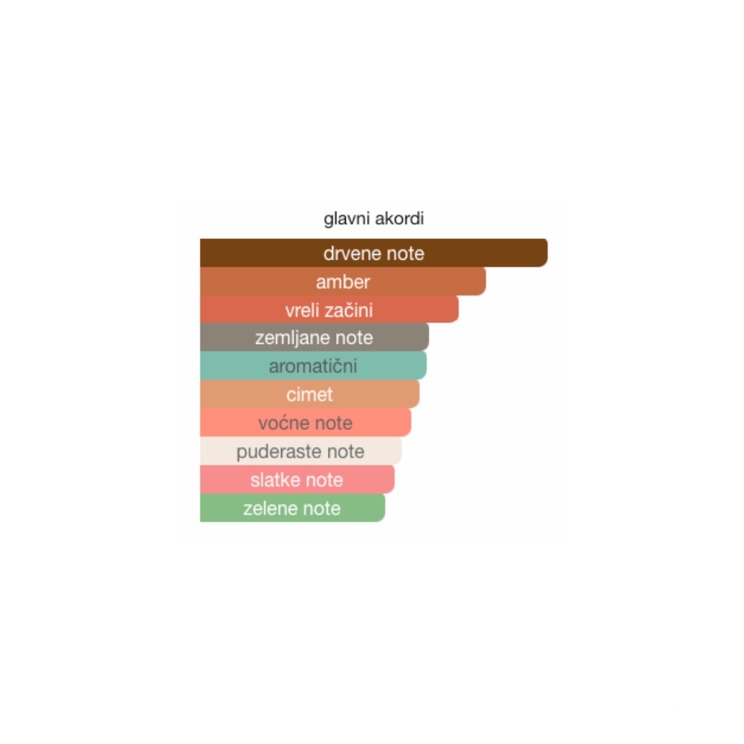 U prvom planu, redak i izuzetan kardamom, zajedno sa vatreno ružičastim biberom, đumbirom i bergamotom, ujedinjuju se u eksplozivnu simfoniju gornjih nota, trenutno osnažujući čula. Iz srca cveta irisa, simbola snage, nastaje baršunasto i luksuzno jezgro. U pratnji nagoveštaja ljubičice i cimeta, ove note dočaravaju živopisne teksture egzotičnog bazara. Utemeljen robusnim esencijama vetivera i hrastove mahovine, delikatno milovan slatkom vanilijom, ovaj miris harmonično balansira tople tonove cimeta, stvarajući spokojnu zemljanu bazu koja podseća na rosom obasjano jutro.