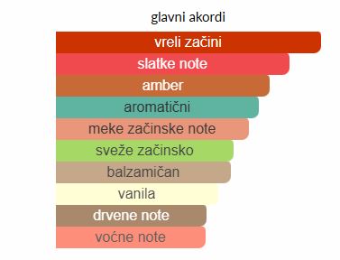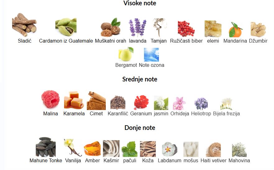 - Srednje note: Malina, Karamela, Frezija, Egipatski geranijum, Jasmin, Orhideja, Karanfilić, Cimet, Heliotrop