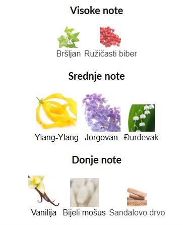 • Bazne note: Vanilija, Beli mošus, Sandalovo drvo