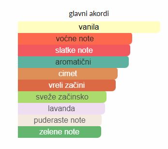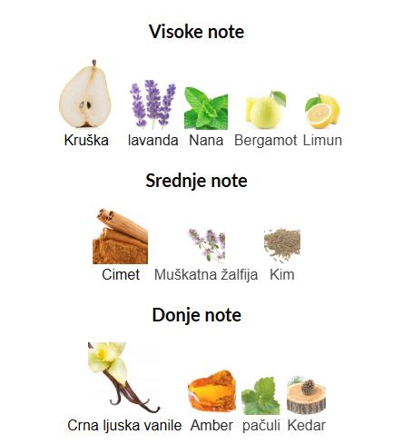 - Gornje note: Kruška, Lavanda, Nana, Bergamot, Limun
