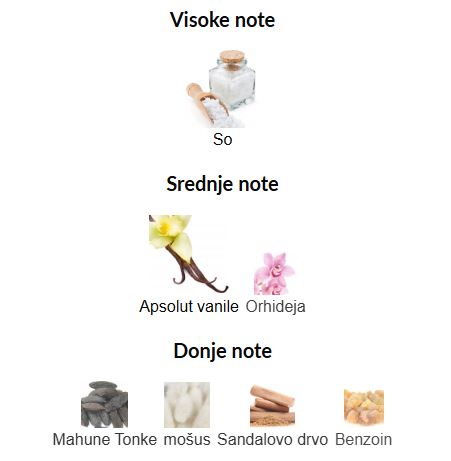 - Bazne note: Mahune tonke, Mošus, Sandalovo drvo, Benzoin