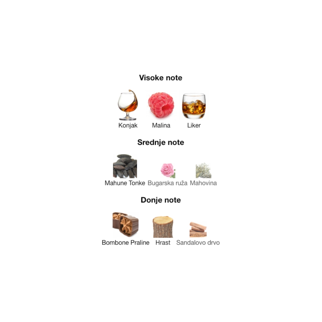 Miris se otvara sa osvežavajućim tonovima citrusa, dok duvan i rum donose bogatstvo i dubinu, stvarajući miris koji je zaokružen i elegantan. U srcu parfema se nalazi badem, koji dodaje blagi, slatki i kremasti karakter, dok se u bazi pojavljuju drvenaste note i vanila, što sve zajedno stvara utisak sofisticirane i luksuzne kombinacije.