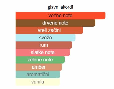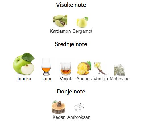 - Srednje note: Jabuka, Rum, Vinjak, Ananas, Vanilija, Mahovina