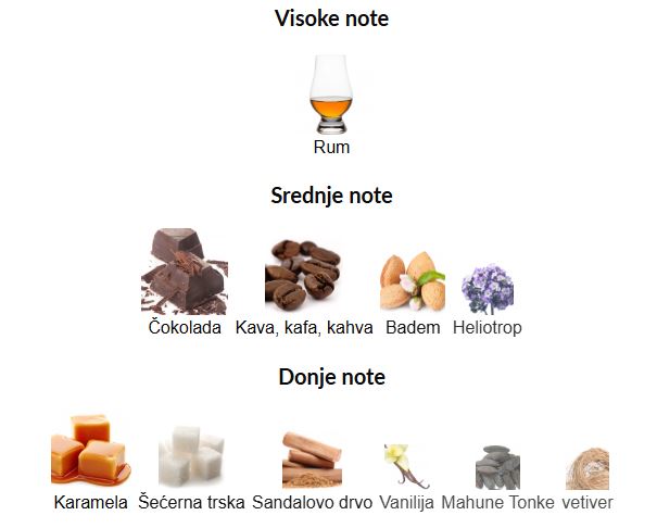 • Srednje note: Čokolada, Kava, Kafa, Kahva, Badem, Heliotrop