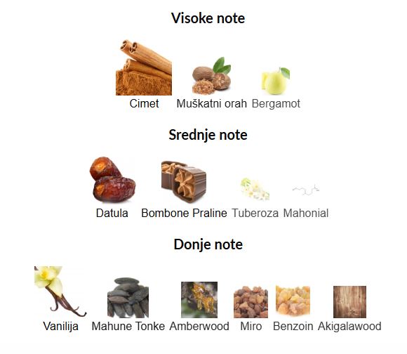 - Bazne note: Vanila, dragoceno drvo, oud, mir, tonka mahune, benzoin i ćilibar.