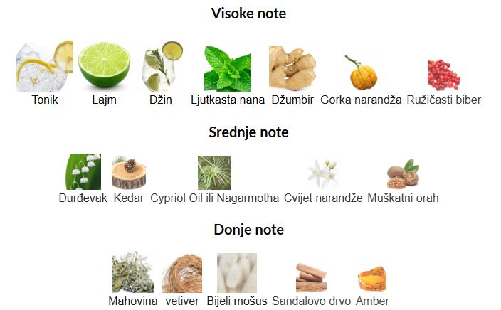 - Gornje note: Tonik, Lajm, Džin, Ljutkasta nana, Džumbir, Gorka narandža, Ružičasti biber
