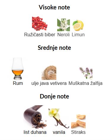 - Srednje note: Rum, Ulje java vetivera, Muškatna žalfija