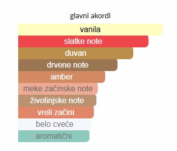 - Bazne note: Tonka mahune, Vanilija iz Brazila, Ambergris, Vetiver sa Haitija