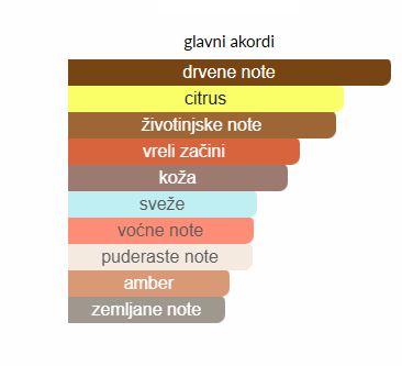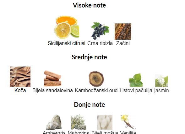 - Srednje note: Koža, Bijela sandalovina, Kambodžanski oud, Listovi pačulija, Jasmin