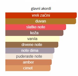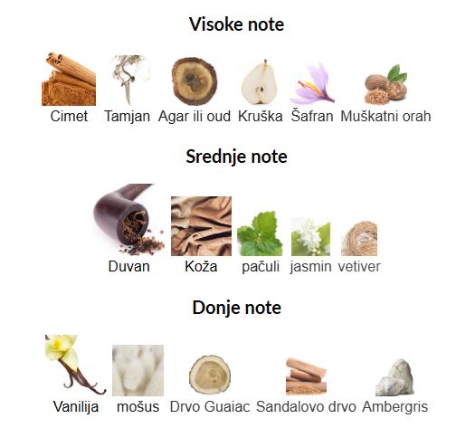 - Gornje note: Cimet, Tamjan, Agar (Oud), Kruška, Šafran, Muškatni orah