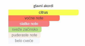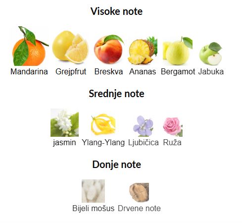 - Gornje note: Mandarina, Grejpfrut, Breskva, Ananas, Bergamot, Jabuka
