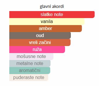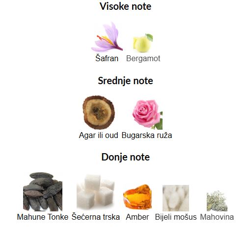 - Donje note: Mahune tonke, Šećerna trska, Amber, Beli mošus, Mahovina