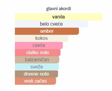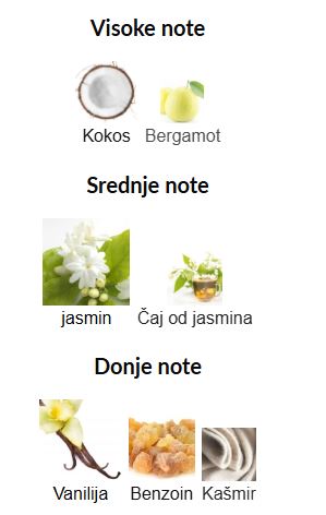 - Donje note: Vanilija, Benzoin, Kašmir drvo