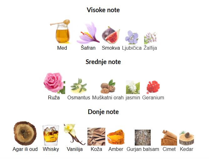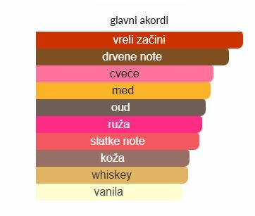 - Donje note: Agar (Oud), Whisky, Vanilija, Koža, Amber, Gurjan balsam, Cimet, Kedar