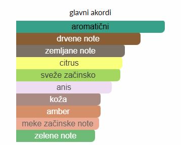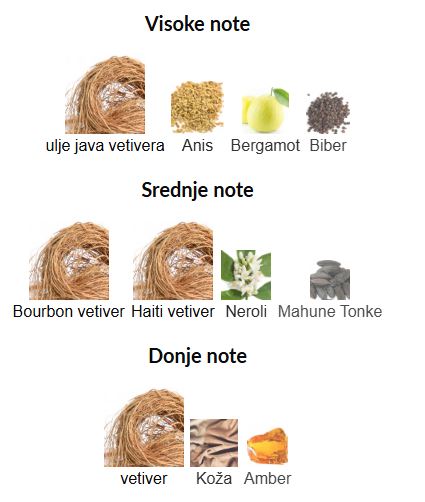 - Gornje note: Ulje Java vetivera, Anis, Bergamot, Biber