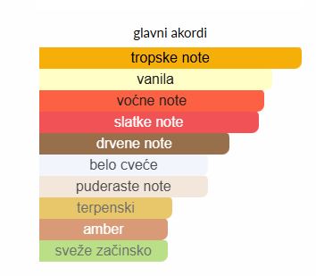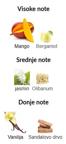 Kompozicija se otvara sočnim mangom i svežim notama bergamota. Zatim se razvija u čisto srce jasmina i kremastog tamjana, dok se završava baznim notama vanile i sandalovine, koje daju slatkoću i dubinu ovoj parfemskoj vodi.