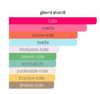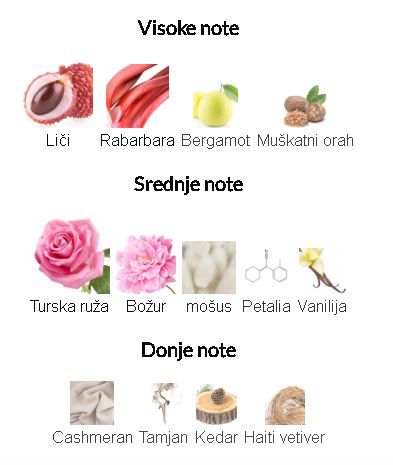 • Gornje note: Liči, rabarbara, bergamot, muškatni oraščić