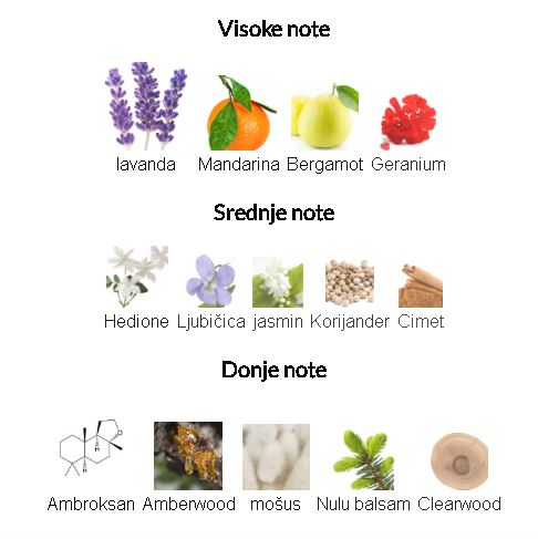 - Gornje note: Lavanda, mandarina, bergamot, geranium