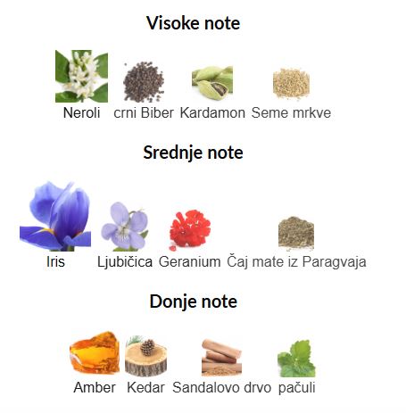 - Gornje note: Neroli, Crni biber, Kardamon, Seme mrkve