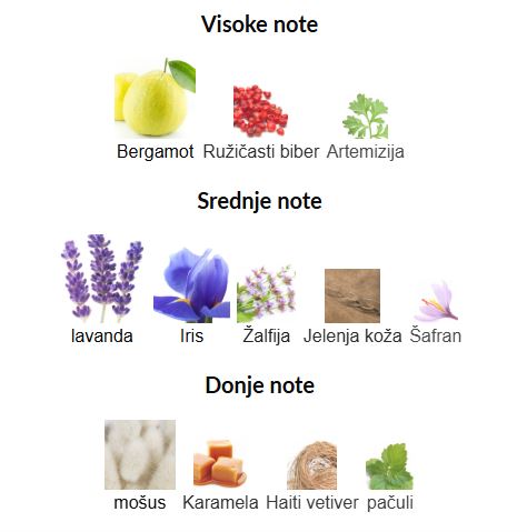 - Srednje note: Lavanda, Iris, Žalfija, Jelenja koža, Šafran