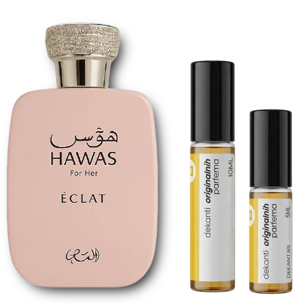Delikatna, zavodljiva i teško joj odoleti, nova Rasasi Hawas Eclat For Her je savremena posveta ženstvenosti. Ovaj upečatljiv ženski miris kombinuje voćnu svežinu, nežne cvetne note i magnetnu senzualnost. Kreiran je za sofisticiranu ženu koja želi da ostavi dugotrajan utisak. Iako nežna, njegova aura je izuzetno očaravajuća.