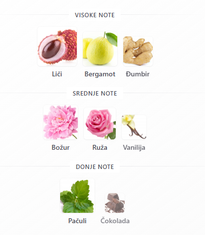 - Srednje note: Med, Cimet, Kašmeran, Jasmin