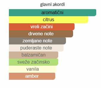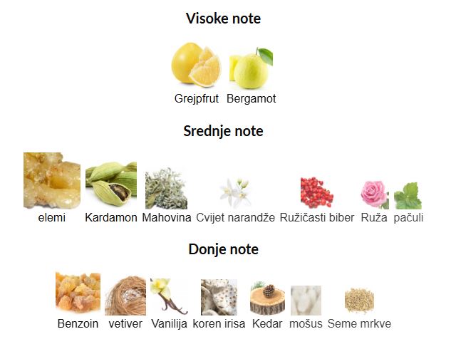 - Bazne note: Sandalovina, Mošus, Kedar, Labdanum, Benzoin, Vetiver, Vanilija, Galbanum, Koren irisa, Mahovina