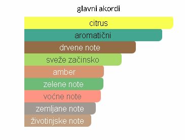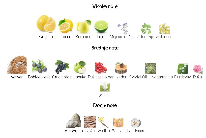 - Gornje note: Limun, bergamot, limeta, grejp, lavanda, timijan, artemisija, mošus – uvode svežinu i začinjenost.