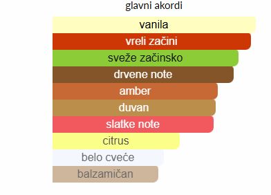 - Srednje note: Konjak, Duvan, Džumbir, Jasmin